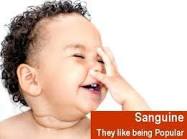 Seseorang yang memiliki keyakinan yang tinggi, dan mudah beradaptasi dengan orang lain dapat dikatakan sebagai suatu sanguinis. Biasanya seseorang yang memiliki karakter sanguinis, suka berkumpul dengan lainnya seperti telah partai dan membuat situasi hidup.Pekerjaan yang cocok untuk sanguinis adalah pemasaran atau hubungan masyarakat